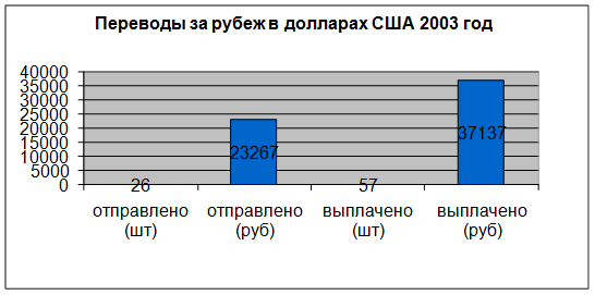 Рис. 2.15. Объем выданных кредитов по зарплатному проекту А вот кредитование по зарплатному проекту только в 2003 году и началось. Но, судя по количеству выданных кредитов, в сравнении с вышеперечисленными кредитами темпы роста оформления этого вида кредитования в ближайшее время будут хорошие. Далькомбанк так же предлагает своим клиентам – физическим лицам, воспользоваться такой услугой, как денежные переводы по всему миру WESTERNUNION. Это перевод денег без открытия банковского счета. Эта услуга в ОАО Далькомбанк г. Биробиджан появилась только в 2003 году. Количество отправленных переводов было в два раза меньше выплаченных.
