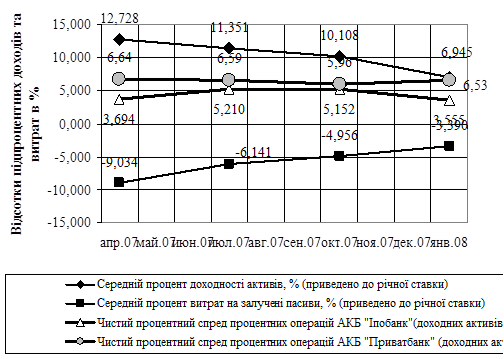 Рис.2.9. Аналіз динаміки чистого процентного спреду процентних операцій ВАТ КБ “Іпобанк” та АКБ “Приватбанк” на протязі 2007 року Окрім цього, рівень систематичного зсуву середньої величини процентного спреду в ВАТ КБ “Іпобанк” становить (–2,0%) відносно рівня середньої величини процентного спреду в АКБ “Приватбанк”, що свідчить про наявність не тільки випадкової складової операційного ризику в ВАТ КБ “Іпобанк”, але і наявність систематичного ризику втрати прибутку банку за рахунок неоптимального управління процентною ставкою витрат на залучені кошти та процентною ставкою доходності кредитних операцій. За результати досліджень дипломної роботи, на сьогоднішній день основним функціональним ризиком діяльності ВАТ КБ «Іпобанк» є ризик втрати ділової репутації кредитної організації (репутаційний ризик) формування оптимальної структури акціонерів банку та взаємовідносин з ними. Так, 6 листопада 2007 р.незалежне рейтингове агентство «Кредит-Рейтинг» оголосило про визначення довгострокового кредитного рейтингу uаВВ+ запланованому випуску іменних відсоткових облігацій (серії А) ВАТ КБ «Іпобанк» (м. Київ) на суму 200 млн. грн. строком обігу 5 років. У ході аналізу агентство використовувало фінансову звітність ВАТ КБ «Іпобанк» за 20062007 рр., а також внутрішню інформацію, надану банком у ході рейтингового процесу [58]. Позичальник або окремий борговий інструмент з рейтингом uaBB характеризується кредитоспроможністю нижчою, ніж достатня, порівняно з іншими українськими позичальниками або борговими інструментами. Висока залежність рівня кредитоспроможності від впливу несприятливих комерційних, фінансових та економічних умов. Знаки «+» і «–» позначають проміжні рівні рейтингів відносно основних рівнів. Фактори, що сприяють підвищенню кредитного рейтингу ВАТ КБ «ІПОБАНК» за висновками рейтингового агентства «Кредит-Рейтинг» (Україна) [58]: прибуткова діяльність з моменту заснування банку та достатній рівень фондової капіталізації; інформаційна відкритість і прозорість. Фактори, що обмежують підвищення кредитного рейтингу ВАТ КБ «ІПОБАНК» за висновками рейтингового агентства «Кредит-Рейтинг» (Україна) [58]: банк здійснює діяльність лише протягом 9 місяців, що за умов відсутності власної регіональної мережі та карткового бізнесу, а також незначної кількості клієнтів та подальшого збільшення присутності системних банків на ринку, суттєво ускладнює виконання стратегічних завдань; виключна концентрація кредитного портфеля, що може негативно вплинути на показники прибутковості при виникненні проблем навіть з незначною часткою кредитів; виключна концентрація ресурсної бази за основними контрагентами, що підвищує ризик ліквідності банку; система управління ризиками перебуває на стадії становлення та потребує удосконалення. РОЗДІЛ ІІІ ПІДВИЩЕННЯ ЕФЕКТИВНОСТІ УПРАВЛІННЯ БАНКІВСЬКИМИ РИЗИКАМИ 3.1 Пропозиції щодо підвищення ефективності управління фінансовими ціновими ризиками банку Згідно з “Методичними рекомендаціями щодо організації процесу формування управлінської звітності в банках України” Національного банку України [22] для підвищення ефективності управління ціновими ризиками банку доцільно впровадити наступні особливості розрахунку резервів у межах управлінського обліку:1. Ризики з метою формування упра