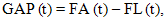де GAP (t) – величина гепу (у грошовому виразі) в періоді t; FA (t) – активи, чутливі до зміни відсоткової ставки в періоді t; FL (t) – пасиви, чутливі до зміни ставки в періоді t. Геп може бути додатним, якщо активи, чутливі до змін ставки, перевищують чутливі зобов'язання (FA(t) > FL(t)), або від'ємним, якщо чутливі зобов'язання перевищують чутливі активи (FA(t) < FL(t)). Збалансована позиція, коли чутливі активи та зобов'язання рівні між собою, означає нульовий геп. За нульового гепу маржа банку буде стабільною, незалежною від коливань відсоткових ставок, а відсотковий ризик – мінімальним. Проте одержати підвищений прибуток внаслідок сприятливої зміни відсоткових ставок на ринку за нульового гепу неможливо. І додатний, і від'ємний геп надають банку потенційну можливість отримати більшу маржу, ніж у разі нульового гепу. Для визначення співвідношення чутливих активів і зобов'язань банку використовують коефіцієнт гепу – FGAP (t), який обчислюється як відношення чутливих активів до чутливих зобов'язань [99]: