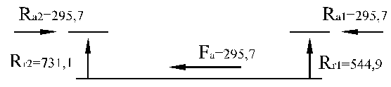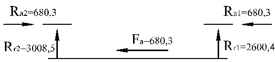 Рисунок 6. Схема нагружения подшипников быстроходного вала Промежуточный вал. Ra 1 = Ra 2 = 680,3 Н Rr 1 = RD ; Rr 2 = RС Rr 1 = 3008,5 Н Rr 2 = 2600,4 Н