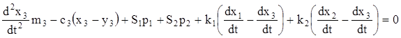 де x1 і x2 - переміщення лез, x3 - переміщення корпусу; y1, y2, – кінематичне збудження свердла з боку деталі; y3 – кінематичне збудження свердла з боку верстата. Для визначення власних частот складаємо систему диференціальних рівнянь та, прирівнявши нулю визначник матриці, одержаної з цієї системи, отримаємо частотне рівняння. Розв'язуючи це рівняння відносно w2, отримаємо:
