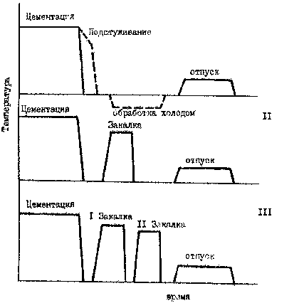 на поверхности заэвтектоидную, состоящую из перлита и вторичного цементита, образующего сетку по бывшему зерну аустенита; звтектоидную, состоящую из однородного пластинчатого перлита и доэвтектоидную, состоящую из перлита и феррита. По мере удаления от поверхности к сердцевине количество перлита уменьшается, а феррита увеличивается. За глубину цементованного слоя принимается сумма заэвтектоидной, эвтоктоидной и половины доээтектоидной зон (до содержания 0,4-0,5 % С). Независимо от способа цементации концентрация углерода в поверхностном слое не должна превышать 1,1-1,2 %. Более высокое содержание ведет к повышению хрупкости стали. Задача цементации - получить высокую поверхностную твердость и износоустойчивость при вязкой сердцевине не решаются одной цементацией. Цементацией достигается лишь выгодное распределение углерода по сечению. Окончательно формирует свойства цементованно детали последующая закалка, после которой на поверхности получается высокоуглеродистый мартенсит, а сердцевина сохраняет нужную твердость и высокую вязкость. После закалки для снятия внутренних напряжений цементованные детали подвергают низкому отпуску при температурах 150-200 0 С. В итоге обеспечивается твердость поверхности HRC 58-62 и сердцевины – HRC 25-35 для легированных сталей. Для углеродистых твердость сердцевины еще ниже. При назначении режима термической обработки цементованных деталей необходимо учитывать следующие обстоятельства: l. Длительный нагрев при цементации вызывает рост аустенитного зерна. 2. Цементованные детали имеют неравномерное распределение углерода по сечению – 0,8-1,2 % с поверхности и 0,I-0,3 %- в сердцевине. В зависимости от требований, которые предъявляются к цементованным деталям, применяются различные варианты термической обработки (рис 3).
