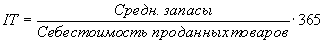 RT показывает насколько эффективно компания организовала работу по сбору оплаты для свою продукцию. Снижение данного показателя может сигнализировать о росте числа неплатежеспособных клиентов и других проблемах сбыта, но может быть связан и с переходом компании к более мягкой политике взаимоотношений с клиентами, направленной на расширение доли рынка. Чем ниже оборачиваемость дебиторской задолженности, тем выше будут потребности компании в оборотном капитале для расширения объема сбыта. Коэффициент оборачиваемости запасов (Inventory Turnover) - финансовый показатель, рассчитываемый как отношение себестоимости проданных товаров к среднегодовой величине запасов. Формула расчета: