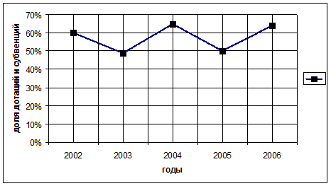 Из таблицы 4 видно, что половину, а то и большую часть составляют доходы от дотаций и субвенций. Если смотреть по годам, то какой либо тенденции к увеличению или уменьшению доли дотаций и субвенций не наблюдается, что можно наблюдать и по графику 1. График 1 График изменения дотаций и субвенций бюджета Аркадакского района с 2002 по 2006 годы[87]