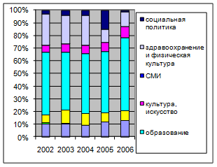 Из диаграммы 3 видно, что в социально-культурной сфере самые большие затраты занимает образование, они составляют почти половину бюджета, а в 2006 году превысили ее и составили 58% затрат бюджета. До 2005 года 23 % бюджета составляли затраты на здравоохранение и физическую культуру. В 2005 и 2006 годах затраты по этой статье расходов были сокращены в 2 раза и составили 10% затрат. По статье искусство и культура можно отметить монотонный рост, но он очень маленький и за пять лет составил всего 2%. Затраты на СМИ на протяжении лет составляли столь незначительную цифру, что она даже не составила 1% расходов бюджета, и с 2005 года затраты на СМИ вошли в статью культура и искусство. Затраты на социальную политику с 2002 по 2004 были стабильными и не превышали 4 %. В 2005 году наблюдается резкий сачок и затраты определяются в 15%, а в 2006 году резкий спад: на социальную политику отведено только 2% бюджета. В сфере экономики в бюджеты 2002-2004 годов были заложены некоторые затраты на с/х и рыболовство. С 2005 года этой статьи в бюджете нет. Что касается транспорта и связи, то на протяжении пяти лет затраты по этой статье не были заложены. Диаграмма 3. Структура расходов бюджета Аркадакского района за 2002-2006 года (в %).[96]