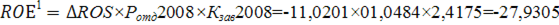 где ЧП – чистая прибыль; СК – собственный капитал; Кзав – коэффициент финансовой зависимости; Ротд – ресурсоотдача; ROS – рентабельность продаж. Из представленной модели видно, что рентабельность собственного капитала предприятия зависит от трех факторов первого порядка: чистой рентабельности продаж, ресурсоотдачи и структуры источников средств, инвестированных в предприятие. Значимость данных показателей объясняется тем, что они в определенном смысле обобщают все стороны финансово-хозяйственной деятельности предприятия: первый фактор обобщает отчет о финансовых результатах, второй — актив баланса, третий — пассив баланса. Факторный анализ может быть выполнен способом абсолютных разниц. Для начала рассчитываем абсолютное изменение коэффициента рентабельности собственного капитала и факторных показателей (1.27):