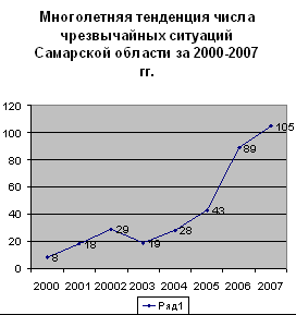 Рис. 1. Оценка многолетней тенденции Приближенная оценка многолетней тенденции возможна при обычной визуальной оценке графика, когда без предварительных расчетов высказываются суждения о наличии роста, снижении или стабилизации числа случаев. Однако отсутствие в этом случае количественных характеристик делает полученные выводы субъективными. В 2007 г. на территории Самарской области продолжился рост числа чрезвычайных ситуаций (ЧС) медицинского характера, связанных с санитарными потерями среди населения. Их число составило 105 (в 2006 г. – 89). Подавляющее большинство ЧС относятся к техногенным, число которых также возросло и составило 86 (в 2006 г. – 76). Таблица № 2. Общие потери населения в чрезвычайных ситуациях