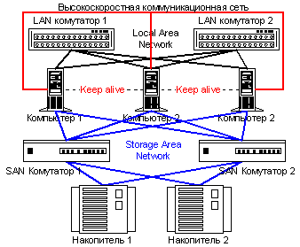 Рисунок 1. Высокоскоростной кластер Почти в любой ориентированной на параллельное вычисление задаче невозможно избегнуть необходимости передавать данные от одной подзадачи другой. Таким образом, быстродействие High Performance кластерной системы определяется быстродействием узлов и связей между ними. Причем влияние скоростных параметров этих связей на общую производительность системы зависит от характера выполняемой задачи. Если задача требует частого обмена данными с подзадачами, тогда быстродействию коммуникационного интерфейса следует уделять максимум внимания. Естественно, чем меньше взаимодействуют части параллельной задачи между собою, тем меньше времени потребуется для ее выполнения. Что диктует определенные требования также и на программирование параллельных задач. Основные проблемы при необходимости обмена данными между подзадачами возникают в связи с тем, что быстродействие передачи данных между центральным процессором и оперативной памятью узла значительно превышает скоростные характеристики систем межкомпьютерного взаимодействия. Кроме того, сильно сказывается на изменении функционирования системы, по сравнению с привычными нам SMP системами, разница в быстродействии кэш памяти процессоров и межузловых коммуникаций. Быстродействие интерфейсов характеризуется двумя параметрами: пропускной способностью непрерывного потока данных и максимальным количеством самых маленьких пакетов, которые можно передать за единицу времени. Варианты реализаций коммуникационных интерфейсов мы рассмотрим в разделе «Средства реализации High Performance кластеров». Проблематика High Availability кластерных систем Сегодня в мире распространены несколько типов систем высокой готовности. Среди них кластерная система является воплощением технологий, которые обеспечивают высокий уровень отказоустойчивости при самой низкой стоимости. Отказоустойчивость кластера обеспечивается дублированием всех жизненно важных компонентов. Максимально отказоустойчивая система должна не иметь ни единой точки, то есть активного элемента, отказ которого может привести к потере функциональности системы. Такую характеристику как правило называют – NSPF (No Single Point of Failure, - англ., отсутствие единой точки отказа).