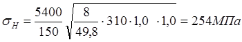 254 МПа < 400 МПа – умова виконується. Розраховуємо максимальне дійсне контактне напруження за формулою: