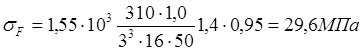 29,6 МПа < 400 МПа – умова виконується. Розраховуємо максимальне дійсне напруження згину за формулою: