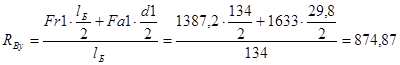 RBX =[-Ft 1 ·(lБ /2)+FМ ·(lМ +lБ )]/ lБ RBX =[-4080·134/2+970·(41,3+134)]/134=-771,189 Перевірка ∑Х=0 RА X - RBX - Ft 1 + FМ =2338,84-(-771,189)+970-4080=0 Будуємо епюру згинаючих моментів МУ1 =0 МУ2 =- RА X (lБ /2)=-2338,84·134/2=-156700 МУ3 = - FМ ·l=-4080·175,279=-170021 Будуємо епюру згинаючих моментів МК =( Ft 1 ·d1 )/2=4080·29,8/2=60690 Сумарні опорні реакції