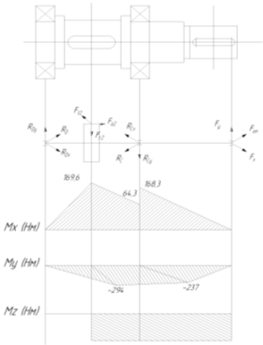 Мал. 4.4. Схема сил у зачепленнях 4.4 Вибір матеріалу валів Швидкохідний вал виконаний заодно ціле з черв’яком. Матеріал виготовлення: сталь 40Х ГОСТ 4543-71 з послідуючою термообробкою – поліпшення (НВ270…320) та гартування СВЧ до отримання твердості HRC 48…53. В цьому випадку σт =750МПа; σв =900МПа; τт =450МПа; σ-1 =410МПа; τ-1 =240МПа; ψτ =0,10 Тихохідний вал виготовляємо зі сталі 40Х ГОСТ 4543-71 з послідуючим поліпшенням до отримання твердості НВ270…320. В цьому випадку σт =750МПа; σв =900МПа; τт =450МПа; σ-1 =410МПа; τ-1 =240МПа; ψτ =0,10 4.5 Розрахунок валів на статичну міцність та опір втомі та розрахунок підшипників на витривалість Розрахунок на статичну міцність Швидкохідний вал Реакції опор В вертикальній площині ∑М3 =0