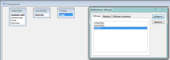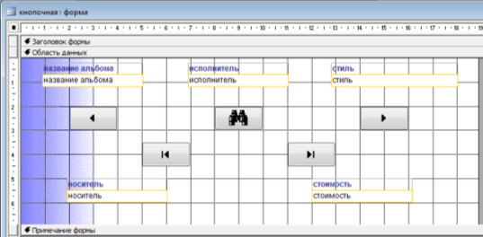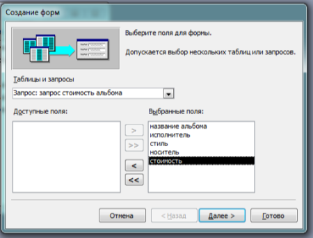 70. Создаю кнопочную форму по таблицам. Выбираю таблицу альбомы, носитель и стиль и из доступных полей перекидываю данные в выборочные поля, нажимаю готово