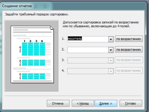 40. Создаю отчет по таблице носитель. Выбираю таблицу носитель и из доступных полей перекидываю данные в выборочные поля, нажимаю далее