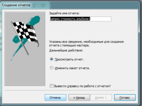 36. Создаю отчет по таблице альбомы. Выбираю таблицу альбомы и из доступных полей перекидываю данные в выборочные поля, нажимаю далее