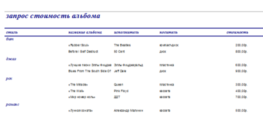 28. В поле условия отбора в столбце стиль указываю рок, а в столбце носитель – кассета. Сохраняю изменения макета.