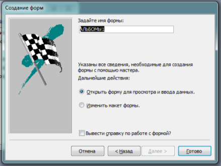 58. Создаю форму по таблице альбомы. Выбираю таблицу альбомы и из доступных полей перекидываю данные в выборочные поля, нажимаю далее