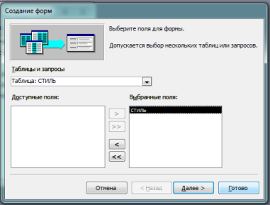 62. Создаю форму по таблице стиль. Выбираю таблицу стиль и из доступных полей перекидываю данные в выборочные поля, нажимаю далее