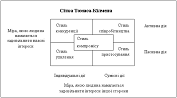 Якщо почати зі сторони, на якій відмічені активні та пасивні дії, то, якщо реакція пасивна, людина буде старатися вийти з конфлікту; якщо вона активна, то людина намагатиметься вирішити його. Верхня частина сітки розкриває сумісні дії. Якщо людина надає перевагу сумісним діям, то вона буде намагатися вирішити конфлікт разом з іншою людиною чи групою людей, які в ньому задіяні. Якщо ж надає перевагу індивідуальним діям, то вона буде шукати свій шлях вирішення проблеми, чи шлях уникнення її вирішення. Коли скласти разом ці дві частини сітки, вийде матриця з п’яти стилів. Для опису типів поведінки людей в конфліктних ситуаціях К. Томас вважає прийнятною двовимірну модель регулювання конфліктів, базовими вимірами якої є кооперація, що пов’язана з увагою до інтересів інших людей, що залучені до конфлікту, та наполегливість, для якої властивий акцент на особистих інтересах. Згідно цих вимірів К.Томас виділяє наступні способи регулювання конфліктів: -конкуренція (змагання) – як прагнення домогтися задоволення своїх інтересів за рахунок інтересів іншого; -пристосування; -компроміс; -ухилення; -співробітництво. Стиль конкуренції. Як показує сітка, людина, що використовує стиль конкуренції, досить активна і в переважній більшості йде до вирішення конфлікту своїм власним шляхом. Вона не дуже зацікавлена у співробітництві з іншими людьми, зате здатна на вольові рішення. Згідно опису динаміки процесу Томасом та Кілменом, людина намагається, в першу чергу, задовільнити власні інтереси, не враховуючи інтереси інших, спонукаючи їх приймати своє власне вирішення проблем. Для досягнення своєї мети, така людина використовує свої вольові якості, і якщо її воля досить сильна, то це їй вдається. Ось приклади тих випадків, коли варто використовувати цей стиль: кінцевий результат є дуже важливим для людини, і вона робить велику ставку на своє вирішення проблеми; людина має достатньо авторитету для парийняття рішення і очевидним є те, що запропоноване їй вирішення – найкраще; рішення необхідно прийняти швидко, і людина має достатньо влади для цього; коли людина відчуває, що в неї немає іншого вибору і їй нема що втрачати. Стиль ухилення. Другий з п’яти основних підходів до вирішення конфліктної ситуації реалізується тоді, коли людина не відстоює свої права, не співпрацює ні з ким для знаходження рішення проблеми чи просто ухиляється від вирішення конфлікту. Цей стиль можна використовувати, коли проблема, якої торкаються, не дуже важлива для людини, коли вона не хоче тратити сили на її вирішення, чи коли вона відчуває, що, знаходиться в безнадійному положенні [3, c. 84]. Нище наведені найбільш типові ситуації, в яких рекомендується використовувати стиль ухилення: напруга дуже велика, і людина відчуває необхідність послаблення напруги; людина знає, що не може або навіть не хоче вирішувати конфлікт на свою користь; людина хоче виграти час, можливо, для того, щоб отримати додаткову інформацію; ситуація дуже складна і людина відчуває, що вирішення конфлікту вимагає надто багадо від неї; намагатися вирішити проблему негайно – небезпечно, оскільки відкриття та обговорення конфлікту може тільки ускладнити ситуацію. В дійсності, відхід або відстрочка від вирішення конфлікту може бути досить вдалою та конструктивною реакцією на конфліктну ситуацію. Стиль п