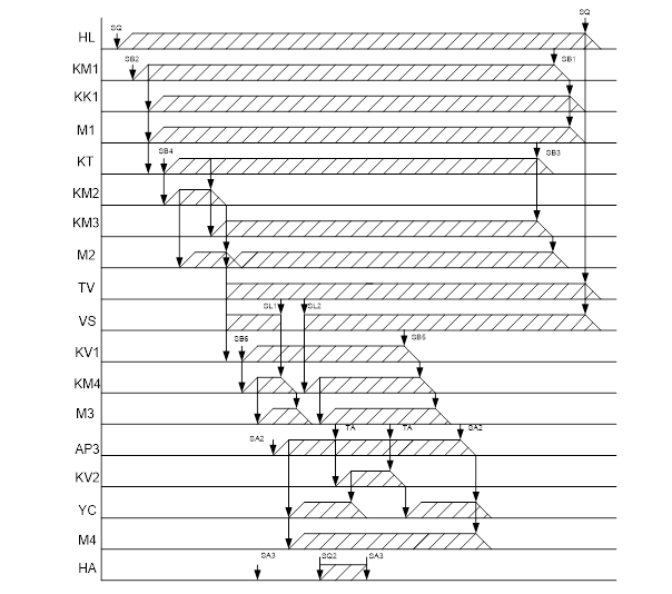 Рис 3. Функциональная схема Из рисунка 3 прослеживается логическая связь между всеми элементами схемы. А именно: Сигнал с командного элемента QS идет на Защитные элементы QF1, QF2, FU1. С защитного элемента QF2 сигнал разделяется и идет на объекты управления М1 и М3. С защитного элемента QF1 сигнал разделяется и идет на объект управления М2, на командный элемент ТА и сигнальный элемент РА. На сигнальный элемент РА также воздействует командный элемент ТА. С командного элемента ТА сигнал идет на управляющий элемент АРЗ. С защитного элемента FU1 сигнал разделяется и идет на задающие элементы SQ1 и SQ2, а также на командные элементы SB1-2 и SA2. Сигнал с задающего элемента SQ2 идет на командный элемент SA3 и на сигнальный элемент HA. Командный элемент SA 3 тоже воздействует на сигнальный элемент НА. С командного элемента SB1-2 сигнал поступает на исполняющий элемент КМ1. С исполняющего элемента КМ1 сигнал идет на командный элемент SA1 и защитный элемент КК1 откуда сигнал поступает на объект управления М1. Защитный элемент КК воздействует на исполнительный элемент КМ1. Сигнал с командного элемента SA1 идет на командный элемент SB3-4. С командного элемента SB3-4 сигнал идет на задающий элемент КТ и исполняющие элементы КМ2 и КМ3. Так же на эти элементы приходит сигнал с задающего элемента SQ1. Задающий элемент КТ воздействует на исполнительные элементы КМ2 и КМ3, которые в свою очередь воздействуют друг на друга и на объект управления М2 Сигнал с командного элемента SA1 поступает на командный элемент SA3, откуда он поступает на управляющий элемент АРЗ. С управляющего элемента АРЗ сигнал идет на исполнительные элементы KV2, C и УС, а также на объект управления М4.На объект управления М4 та воздействует исполняющий элемент С. Исполнительный элемент KV2 воздействует на исполнительный элемент УС. Cзадающего элемента КТ сигнал приходит на понижающий трансформатор TV, на который в свою очередь приходит сигнал с исполнительного элемента КМ 2 и с командного элемента SA 1. С управляющего элемента TV сигнал поступает на исполнительный элемент VD1-4, откуда он поступает на защитный элемент FU2. С защитного элемента FU2 сигнал поступает на исполняющий элемент УС, командный элемент SB5-6 и задающие элементы SL1, SL2 и командный элемент VS. С задающих элементов SL1 и SL2 сигнал тоже поступает на командный элемент VS. С командного элемента SB5-6 сигнал поступает на защитный элемент КК2. С которого он разделяется и поступает на исполняющие элементы КМ4 и KV1, которые в свою очередь воздействуют на защитный элемент КК2. Исполнительный элемент KV воздействует на исполнительный элемент КМ4. Также на исполнительный элемент КМ4 воздействует командный элемент VS. Исполнительный элемент в свою очередь воздействует на на командный элемент VS. Сигнал с исполнительного элемента КМ4 поступает на объект управления М3. 6. Расчет и выбор средств автоматизации 6.1 Выбор средств автоматизации 6.1.1 Выбор датчиков уровня SL1 и SL2. В данном случае выбираем датчики уровня SL1 и SL2 типа МДУ-2. Это мембранные датчики уровня, используемые для сыпучих материалов. 6.1.2 Выбор конечных выключателей В качестве конечных выключателей выбираем выключатели типа ВК-200 с одним замыкающим и одним размыкающим контактами. Они рассчитаны на напряжение 220 В и ток 6 А. 6.1.3 Выбор звонка Используем звонок типа ЗВП-220. Питанием от 220 В. 6.1.4 Выбор трансформатора тока Выбираем тр