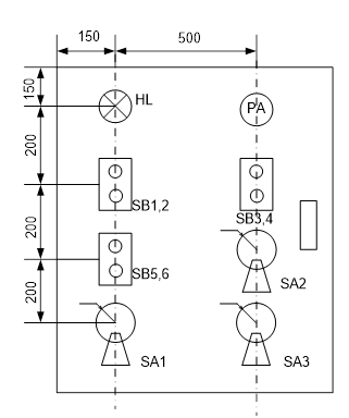 Рис 5. Вид на заднюю стенку щита На стенке размещаются следующие приборы. В верхнем левом углу находится рубильник. В один столбец с ним располагаются два автомата и два предохранителя. С права от рубильника находится магнитный пускатель КМ1. С низу от пускатель в ряд расположены еще три магнитных пускателя КМ2, КМ3 и КМ4 соответственно. Справа от пускателей расположены (сверху в низ): промежуточные реле KV1 и KV2, реле времени и два тепловых реле КК1 и КК2. С права от них расположены: сверху семистор VS, ниже диод VD5, ниже диодный мост VD1-4, ниже понижающий трансформатор TV, ниже устройство автоматической регулировки загрузки АРЗ, ниже сопротивление R, ниже трансформатор тока ТА и еще ниже конденсатор С. В самом низу располагается клемник ХТ1. Далее разрабатывается дверца щита управления. Она изображена на рисунке 6.
