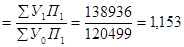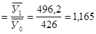 Найдем абсолютное изменение средней урожайности: ∆= ∆=496,2-426=70,2 ц/га Средняя урожайность в отчетном году увеличилась на 70,2 ц/га. Проверим правильность проведенных расчетов. Для этого рассчитаем индекс переменного состава, равного произведению индекса постоянного состава и структурных сдвигов: Упер.с.