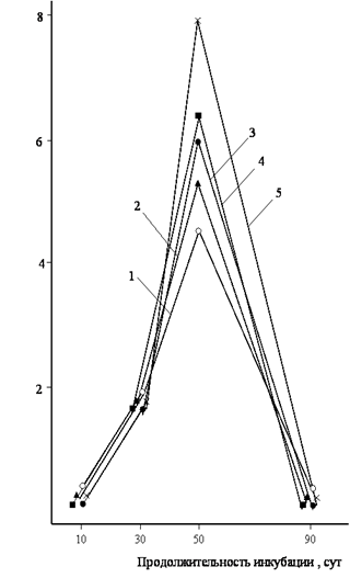 1 – почва без осадка; 2-5 – соответственно с дозой осадка 30,90,150,300 т/га Затем, по мере деструкции легко усваиваемой органики, развиваются актиномицеты (рис. 1б) и микроскопические грибы (рис. 2), которые способны разлагать трудноокисляемые продукты. Вся сапрофитная микрофлора достигает максимума развития в интервале 10-50 суток инкубации. При завершении деструкции органических веществ начинается рост хемотрофных микроорганизмов, численность которых возрастает к завершению экспозиции (рис.3). Рисунок 2