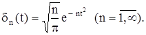 При n®¥функция dn (t) вытягивается до бесконечной высоты в точке t= 0, а вне ее становится равной нулю, сохраняя свойство (1). В обычном понимании предел dn (t) при n®¥не существует. Предел limdn (t) = d(t) n®¥ можно рассматривать как обобщенную функцию, то есть функцию, которая порождается скалярным произведением