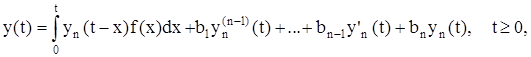 t®+0 Запишем уравнение (8) в обобщенных функциях, продолжив функцию f(t) и искомое решение нулевым значением для t<0. Введем функции