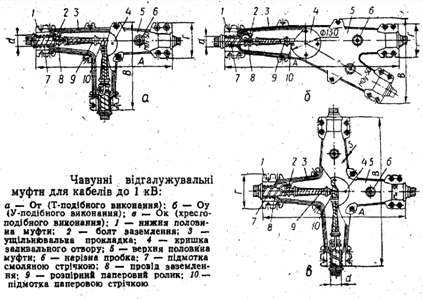 Заземлюючий провід приєднують до оболонки і бронепокриття кабелю паянням, виконуючи його в такій послідовності. Зачищають сталевою щіткою до металевого блиску бронепокриття і свинцеву оболонку кабелю та облуджують їх, припоєм ПОС-30, а алюмінієву оболонку кабелю — припоєм А. Сплющують один кінець заземлючого проводу і припаюють його до оболонки та бронепокриття одного з кабелів. Крім паяння заземлюючий провід, міцно прикріплюють до оболонки і бронепокриття двома банданець заземлюючого проводу і припаюють його до оболонки та бронепокриття складається із сталевих стрічок, то провід заземлення припаюють до обох стрічок, якщо ж бронепокриття виконана плоским або круглим дротом, то провід заземлення припаюють до-всіх-дротин по колу кабелю. Обмежуватися лише паянням або лише кріпленням заземлюючого провідника бандажами забороняється. Для приєднання, заземлюючого проводу до контактної площадки муфти на його вільний кінець приварюють або напресовують наконечник. Аналогічно приєднують і окінцьовують наконечником заземлюючий провід другого із з'єднуваних кабелів. Після завершення операції з'єднування струмопровідних жил кабелів і приєднання до них заземлюючих проводів переходять, до монтажу з'єднувальної муфти. 3.3 Монтаж чавунних з'єднувальних муфт Монтаж чавунних муфт починають з очищення обох її половинок від бруду та іржі і попереднього примірювання на ділянці з'єднання. Встановивши під з'єднаними жилами нижню половину муфти, відмічають на кабелі ділянки, де будуть розташовані горловини муфти і, видаливши половину муфти, накладають на ці ділянки підмотку з кількох шарів просмоленої стрічки. Діаметр підмотки повинен бути дещо більшим за внутрішній Діаметр горловин муфти, щоб створити необхідне ущільнення в місцях входу кабелів у муфту. Далі встановлюють на ділянці з'єднання нижню половину муфти так, щоб підмотки із смоляної стрічки опинилися над горловинами муфти, і приєднують до контактних площадок наконечники заземлюючих проводів. Потім вкладають у паз нижньої половини муфти ущільнювальну прокладку з провареного, в бітумній мастиці прядив'яного канатика, накривають її верхньою половиною муфти і міцно скріплюють болтами, стежачи за тим, щоб болти затягувалися рівномірно для уникнення перекосу половинок муфти. Як ущільнювальна прокладка в муфті може бути використана також маслостійка гума або проварена в бітумній мастиці пряжа "подушки", знята з кабелю під час його обробки. Однією з найвідповідальніших операцій монтажу муфти є заливання її кабельною мастикою. Неправильне заливання муфти буває найчастішою причиною пробивання ізоляції між її жилами в місці з'єднання внаслідок накопичення вологи в муфті. Заключну операцію — заливання чавунної муфти — виконують після розігрівання її і кабельної мастики. Полум'ям газового паль-ника підігрівають муфту до 60-70 °С, підносять до неї розігріту в спеціальному відрі до 160-180 °С кабельну мастику МБ-70 або МБ-90 і заливають нею внутрішню порожнину муфти спочатку на 3/3 і на 3/4, а потім повністю. Після завершення, заливання кабельна мастика повинна охолонути до 35-30 °С. Під час охолодження кабельної мастики дещо зменшується її об'єм (відбувається усадження), тому після охолодження муфти здійснюють остаточне доливання мастики. Склади кабельних мастик вибирають залежно від м
