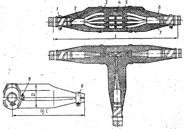 Рис. 7. Епоксидна відгалужувальна муфта типу ОЕ для кабелів напругою до 1 кВ: 1 — підмотка з бавовняної стрічки, промазаної епоксидним компаундом — провід заземлення; 3 — розпірка; 4 — відгалуження жил: 5 — відгалужу вальна гільза; 6 — верхня половина форми; 7 — нижня половина форми; 8 — стяжний болт; 9 – хомут Під час монтажу муфти типу СЕс (рис. 81, г) тимчасово встановлюють на місце половину знімної сталевої форми і примірюють, чи достатня Довжина проводу заземлення попередньо прикріпленого та припаяного до оболонки і броні одного із з'єднуваних кабелів), щоб можна було вивести його через горловину муфти. Вкладають провід заземлення, як показано на рисунку після чого форму знімають, а провід заземлення прикріплюють і припаюють до бронестрічок та оболонки іншого кабелю. Встановлюючи форму на ділянці з'єднання, для заливання компаунда її внутрішню поверхню змащують тонким шаром трансформаторного масла або солідолу, щоб легше було видаляти форму після затвердіння компаунда. Подальші монтажні операції виконують так само, як при монтажі муфти СЕп. Після затвердіння компаунда форму знімають. Для монтажу муфти СЕс можна застосовувати форму з пластмаси, внутрішню поверхню якої не змащують, а після затвердіння компаунда із з'єднання не знімають. А З'єднувальні епоксидні муфти-кабелів, прокладених у тунелях, каналах та інших кабельних спорудах, захищають від механічних пошкоджень, розташовуючи їх у захисних кожухах. Кожух являє собою відрізок товстостінної металевої труби завдовжки 1250 мм і діаметром не менше 150 мм, внутрішня поверхня якої викладена двома шарами листового азбесту завтовшки 4-5 мм. Торці труби після розміщення в ній муфти закривають кришками (заглушками) з азбестоцементу завтовшки 20 мм, при цьому одну з кришок закріплюють гвинтами, а другу встановлюють без кріплення. З'єднувальна муфта повинна бути зміщена в кожусі в бік закріпленої кришки. Під час монтажу муфти ОЕ (рий. 82) операції обробки кінців кабелів і відгалуження струмопровідних жил виконують аналогічно операціям з відгалуження в чавунній муфті Сто. Епоксидний компаунд заливають на місці роботи в знімну жорстку форму з металу або пластмаси. Встановлення і заливання знімної форми епоксидним компаундом здійснюють так само, як у процесі монтажу епоксидних з'єднувальних муфт СЕ. 4. ТЕХНІКА БЕЗПЕКИ 4.1 Міри безпеки при прокладці кабелів При прокладці кабелю завантаження і вивантаження барабанів роблять вантажопідйомні машини. Скидання барабанів із транспортних засобів не допускається. Для безпеки працюючих при перекочуванні барабанів вживають заходів, що виключають захоплення за виступаючі частини їхнього одягу. Для цього попередньо видаляють цвяхи, а кінець кабелю надійно закріплюють на щоці барабана. При перекочуванні барабана на його шляху електромонтажникам знаходитися не дозволяється.вибирають рівні площадки, щоб у процесі робіт не відбувалося їхнє мимовільне падіння. При підйомі барабана застосовують сталеві осі наступного діаметра, мм: не менш 60 при масі барабана до 2500 кг; не менш 70 при масі до 3500 кг і не менш 75 при масі до 5000 кг. Кабельні чи домкрати візки повинні мати вантажопідйомність, що відповідає масі барабана з кабелем. При підйомі барабана на кабелерозкочувальний пристрій перевіряють справність щік і втулок. Розкочування кабелю з барабанів д