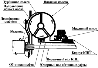 Рисунок 2. Устройство гидротрансформатора. При трогании автомобиля с места вращающиеся лопатки насосного колеса отбрасывают рабочую жидкость (масло) на лопатки неподвижного турбинного колеса. Протекающая между лопаток жидкость имеет энергию. Когда турбинное колесо неподвижно, то сила соударения жидкости с поверхностью лопатки наибольшая, что позволяет создавать крутящий момент на турбинном колесе, превышающий крутящий момент на двигателе в несколько раз. Реакторное колесо получает отраженную от турбинного колеса волну жидкости и направляет её на вход насосного колеса. Поскольку реакторное колесо получает отраженный поток жидкости, который заставлял бы его вращаться в противоположную сторону от направления вращения коленвала, муфта свободного хода заблокирована, реакторное колесо неподвижно. Когда автомобиль тронулся и набрал скорость, турбинное колесо начинает вращаться со скоростью, равной скорости насосного колеса. Соударение потока жидкости с лопатками турбинного колеса почти не происходит, момент на турбинном (выходном) колесе равен моменту на входном (насосном) колесе. При отпускании педали акселератора двигатель ещё замедляет своё вращение. Жидкость перестает отражаться от лопаток турбинного колеса и толкать реакторное колесо в сторону, обратную направлению вращения коленвала. Напротив, реакторное колесо получает напор жидкости, увлекающий его в сторону вращения коленвала. В этом направлении муфта свободного хода позволяет реакторному колесу свободно вращаться. Блокировка гидротрансформатора Lock-Up. В связи с повышением требований к топливной экономичности автомобилей существует необходимость в применении блокировки (выключении из работы) гидротрансформатора. Блокировка достигается несколькими путями: только гидравлическим и механическим, либо комбинацией гидро- и электропривода при использовании управления микропроцессором или электронной схемой. Для блокировки применяются следующие исполнительные механизмы: гидравлический поршень в виде диска, связанным с турбинным колесом, центробежная муфта, планетарная передача, механическое соединение входного и выходного вала гидротрансформатора.
