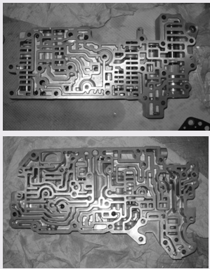 Рисунок 9. Муфта свободного хода. ГидроцилиндрыГидроцилиндры являются исполнительными механизмами для включения передач. Они преобразуют давление масла в усилие, включающее сцепную муфту. Гидроцилиндр состоит из корпуса, поршня с уплотнительной манжетой, возвратной пружины, штуцера для подвода рабочей жидкости. Жесткость пружины определяет момент начала срабатывания гидроцилиндра. Для срабатывания дисковых сцепных муфт применяется конструкция гидроцилиндра, встроенного в дисковую муфту. Масло подаётся вовнутрь кожуха дисковой муфты. Уплотнительные манжеты не дают вытечь маслу. Масло давит на диафрагму и создаёт усилие, прижимающее ведомые диски к ведущим. На внешнем периметре корпуса имеется разгрузочный клапан, который позволяет быстрее снять давление с муфты при её отключении. Корпус блока клапанов .Корпус блока клапанов (Рисунок 10) является сердцем гидравлической системы управления. Он является сложной сетью взаимосвязанных каналов, прецизионных клапанов, пружин, шариковых клапанов и штуцеров. Узел в сборе содержит гидравлический клапан управления включением передач, дроссельный регулирующий клапан и клапаны выключения передач, клапаны управления включением передач и на некоторых модификациях КПП - регулирующий клапан. Корпус блока клапанов работает как компьютер. Он запрограммирован на определённый режим работы гидравлическим клапаном управления включением передач и отслеживает два гидравлических сигнала - один от дроссельного регулирующего клапана, и другой - от датчика скорости автомобиля. На основании этих данных выбирается момент переключения передачи. Третий сигнал воспринимается от рычага управления КПП. Этот сигнал даёт команду на принудительное включение водителем пониженной передачи. В режиме ручного управления нужная передача определяется положением золотника управления. В автоматическом режиме включением передач управляют два узла: клапан включения передач, базируясь на показаниях датчика скорости и дроссельного регулирующего клапана. Блок включения передач обеспечивает как автоматическое, так и ручное переключение передач. Ручное переключение передач обеспечивается с помощью гидравлического клапана управления включением передач и обычно включает в себя нейтраль, задний ход, все передачи переднего хода плюс режимы торможения двигателем. Автоматическое переключение передач обеспечивается в соответствии со скоростью движения.