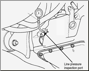 Замените фильтр АКПП на новый, предварительно установив на него прокладку. - Установите поддон фильтра и заверните три болта (момент затяжки 10 Н*м). - Установите магниты в поддон. При установке убедитесь, что магниты не упираются в масляные трубки. - Замените прокладку поддона и установите поддон на корпус АКПП. - Заверните 18 болтов (момент затяжки 9 Н*м). - Заверните сливную пробку (момент затяжки 17 Н*м). - Залейте новую рабочую жидкость ATFSPIII. Заправочный объем около трех литров. Жидкость следует заливать через наливной патрубок до нижней отметки масляного щупа. - Запустите двигатель и, в режиме холостого хода, переведите селектор во все положения от "P" до "1" и обратно в положение "Р". Рычаг выбора передач должен передвигаться свободно, без каких-либо заеданий. Нажав педаль тормоза и, управляя селектором, пробуйте включать каждую передачу. Передачи должны включаться без рывков и посторонних звуков. Допускается задержка при переключении 0,7 – 1,0 секунды. - Во время работы двигателя в режиме холостого хода проверьте уровень жидкости. При необходимости долейте жидкость до нижней метки на масляном щупе. - Осмотрите поддон. Убедитесь, что утечки масла через поддон и сливную пробку нет. - Произведите пробную поездку. Пробуйте использовать различные режимы АКПП. Убедитесь, что во время движения автомобиля передачи переключаются плавно, без толчков, ударов и рывков. Так же убедитесь в отсутствии посторонних шумов при работе АКПП во время движения. Норма – часов на выполнение операции: 3,5 Проверка давления жидкости в системе. - Прогрейте двигатель до рабочей температуры.