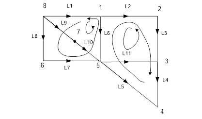 1) Список ветвей: 8-71 8-61 5-1 1 1-2 1 7-5 хорда 6-5 хорда 2-3 1 5-3 хорда 5-4 1 3-4 хорда 2)Ориентация ветвей от базисного узла. 3)Ориентация хорды, задаём направления. 4) Построение первой матрицы инциденции: