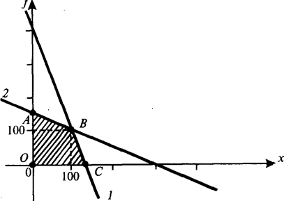 Рис.1. Графический вариант решения модели (1)—(5): 1 — в соответствии с выражением (1); 2 — в соответствии с выражением (2). Максимального значения, равного 90 000 ден.ед., функционал (5) достигает в вершине В, т.е. максимальный чистый дисконтированный доход, равный 90000 ден.ед., бизнесмен может получить, если приобретет 100 факсов и 100 ксероксов. Итак, в качестве функционала нашей модели был рассмотрен некий простейший аналог критерия NРV, а в качестве значений правых частей ограничений модели использовались лимиты ресурсов проекта в денежном выражении. Неизвестными в данной задаче являлись стоимостные значения объемов проектных услуг. На основании теории двойственности в математическом программировании можно построить задачу, двойственную данной, а полученные при ее решении так называемые двойственные переменные (объективно обусловленные оценки, теневые цены, скрытые цены, неявные цены) позволяют определить альтернативную стоимость используемых в проекте дефицитных ресурсов. Построим задачу, двойственную нашей. Пусть p1 — двойственная оценка фондов в первый год; p2 — двойственная оценка фондов во второй год. В этих обозначениях, необходимо минимизировать общие альтернативные стоимости совокупного объема фондов в целом за период проекта, т. е. минимизировать функцию Z = (40 000 p1 + 30 000 p2 ) при следующих ограничениях: 100p1 + 200 p2 ≥ 400; 300p1 + 100 p2 ≥ 500; Экономический смысл ограничений состоит в том, что продажа всех ресурсов (фондов), затрачиваемых на единицу каждого вида оборудования (факса или ксерокса) по их альтернативной стоимости в сумме не может быть меньше чистого дисконтированного дохода от одного факса или ксерокса (соответственно). Кроме того, альтернативные стоимости, как реальные экономические величины, не могут иметь отрицательных значений,поэтому: p1 ≥ 0; p2 ≥ 0; Уже этот простой пример наглядно демонстрирует возможности и преимущества использования методов математического программирования для принятия проектных решений. Экономико-математическая сущность анализа чувствительности состоит в следующем: на основе базового варианта проекта определяют ожидаемое среднее отклонение каждой переменной величины (фактора) и результаты проекта в случае отклонения одной из переменных величин от базового сценария. Предполагают, что проект более чувствителен к изменению одного из параметров базового варианта, чем другого, если отклонение первого параметра дает большее отклонение критерия NРV — чистого дисконтированного дохода проекта (или другого критерия, выбранного для оценки) по сравнению с базовым сценарием. Построим количественный показатель чувствительности проекта sens(у,хi ).Пусть у — некоторый критерий эффективности проекта. Он может быть функционально выражен через параметры проекта хi , т.е. у = у(x1 ,x2 ,...,xk -1 , xk ). В качестве показателя чувствительности проекта к изменению параметра х, рассчитаем отношение относительного приращения критерия к относительному приращению параметра: