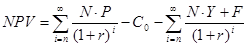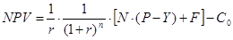 Величина sens (у, хi ) показывает, на сколько процентов изменится значение критерия у проекта при изменении параметра хi на один процент. Пример. Рассмотрим проект строительства нового завода по производству лазерных дисков. Первоначально требуется вложить денежные средства в строительство завода и покупку технологии. Первоначальные затраты представляют собой фиксированное значение величины С0 , которая инвестируется сразу в момент времени t = 0. Предположим, что ежемесячный выпуск будет постоянным и равным N лазерных дисков в месяц при постоянной же себестоимости Y, тогда ежемесячные издержки по выпуску равны NY. Пусть ежсмесячные постоянные издержки составят F. Производство лазерных дисков нaчнется через п месяцев после начала проекта. Денежные поступления (выгоды) от проекта будут идти только в виде выручки от продажи продукции и цена Р одного лазерного диска постоянна во времени. Длительность проекта во времени не ограничена. Чистый дисконтированный доход (NPV) проекта можно рассчитать на основании следующего уравнения: