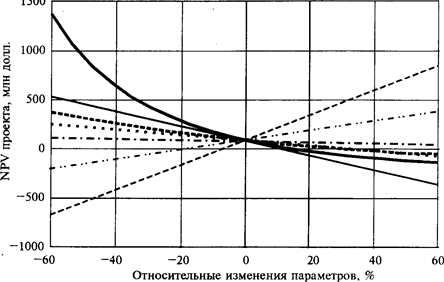 Рис.2. Чувствительность NPV к относительным изменениям параметров: · · · · Со; - ·· - N ; ----- Р; —— У; —— r; -·- F; ----п Базисное значение критерия чистого дисконтированного доходаNPV0 = 85 543 289 долл. Проведем анализ чувствительности, т.е. проанализируем "реакцию" изменений NPVна последовательные относительные изменения параметров проекта. Показатели чувствительности NPV к изменению значений параметров имеют следующие значения: