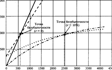 Рис· 7.4. Поиск точки безубыточности: —— накопленные доходы; --- накопленные издержки; ---- r = 0; -·- r = 10% Она может быть найдена следующим образом (см.рис.4):