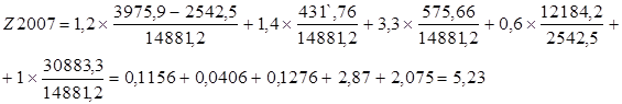 де Х1 = (Поточні активи - Поточні пасиви) / Обсяг активу; Х2 = Нерозподілений прибуток / Обсяг активу; Х3 = Прибуток до виплати відсотків / Обсяг активу; Х4 = Ринкова вартість власного капіталу / Позикові засоби; Х5 = Виторг від реалізації / Обсяг активу; При Z < 1,8 - імовірність банкрутства дуже висока; 1,8 < Z < 2,7 - імовірність банкрутства середня; 2,7 < Z < 2,99 - імовірність банкрутства невелика; Z > 2,99 - імовірність банкрутства незначна. Розрахунок інтегрального показника Альтмана за даними балансу ВАТ “Дніпропетровський хлібозавод №9” за 2007 рік , дає наступні значення :