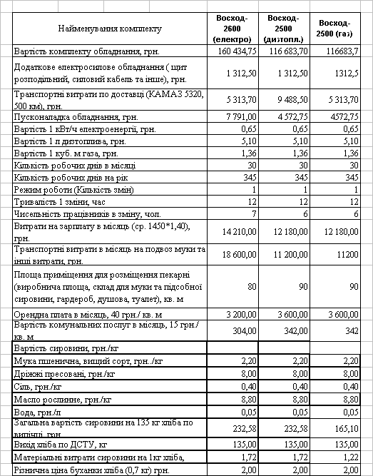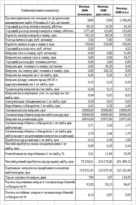 2. Фонд оплати праці (ФОП) на 1 кг хліба (середня заробітна плата на місяць х Квиплат до соцфонду * чисельність працюючих у зміну х кількість змін : (продуктивність пекарні х кількість робочих днів у місяці)) складає: 450 грн./мес. х 1,4 х 4 х 1 : (1300кг х 30) = 0,0646 грн./кг 3. Транспортні витрати на 1 кг хліба (транспортні витрати на місяць : (продуктивність пекарні х кількість робочих днів у місяці)) складають: 900 грн. : (1300 х 30) = 0,023 грн./кг 4. Витрати на комунальні послуги й орендну плату на 1 кг хліба (площа приміщення х (вартість комунальних послуг + орендна плата) : (продуктивність пекарні х кількість робочих днів у місяці)) складають: 120м2 х (15,0 +2,0) : (1300 х 30) = 0,052 грн./кг 5. Амортизація устаткування на 1 кг хліба ((вартість пекарні + вартість додаткового електросилового устаткування) х річна норма амортизації (6,5 %) : (продуктивність пекарні х кількість робочих днів у році)) складає: 5.1. Пекарня «ВОСХОД-1300Р» (на дизельному паливі): (72313,33+916,67+5630+1875,5)грн. х 0,065 : (1300 х 345) = 0,012 грн./кг 5.2. Пекарня «ВОСХОД-1300Р» (на газі): (78841,67+916,67+5630+1875,5)грн. х 0,065 : (1300 х 345) = 0,013 грн./кг 6. Собівартість 1 кг хліба (матеріальні витрати + витрати на енергоносії + фонд оплати праці + транспортні витрати + витрати на комунальні послуги й орендну плату + амортизація устаткування ) складає(з обліком уплаченого ПДВ –20%): 6.1. Пекарня «ВОСХОД-1300Р» (на дизельному паливі): 1,30 + 0,066 + 0,0646 + 0,023 + 0,052 + 0,012 = 1,5176 грн./кг 6.2. Пекарня «ВОСХОД-1300Р» (на газі): 1,30 + 0,029 +0,0646 + 0,023 + 0,052 + 0,012 = 1,4806 грн./кг 7. Чистий доход підприємства від реалізації 1 кг хліба (роздрібна ціна 1 кг хліба – собівартість), де роздрібна ціна 1 кг хліба це роздрібна ціна 1 буханця хліба : вага = 1,2 грн. : 0,75 = 1,60 грн. складає,при цьому з ціни реалізації стягується різниця полученого й уплаченого податку ПДВ (20%)[14].: 7.1. Пекарня «ВОСХОД-1300Р» (на дизельному паливі): 1,60 грн.*5/6* – 1,5176 грн.*5/6 = 0,0687 грн./кг 7.2. Пекарня «ВОСХОД-1300Р» (на газі): 1,60грн.*5/6 – 1,4806 грн.*5/6 = 0,0995 грн./кг 8. Рентабельність виробництва по чистому прибутку підприємства складе ( як відношення чистого прибутку з 1 кг хліба до витрат на виробництво 1 кг хліба) : 8.1. Пекарня «ВОСХОД-1300Р» (на дизельному паливі): 0,0687/1,5176*(1-0,25) * 100 % = 3,39 % 8.2. Пекарня «ВОСХОД-1300Р» (на газі): 0,0995/1,4806*(1-0,25) *100 % = 5,04 % 9. Основні витрати (вартість пекарні + додаткове електросилове устаткування + транспортні витрати по доставці + монтаж і пусконаладка устаткування) складають: 9.1. Пекарня «ВОСХОД-1300Р» (на дизельному паливі): 72313,33+916,67+5630,0+1875,5 = 80735,5 грн. 9.2. Пекарня «ВОСХОД-1300Р» (на газі): 78841,67+916,67+5630,0+1875,5 = 87263,84 грн. 10. Строк окупності, днів (основні витрати : (чистий прибуток з 1 кг хліба х продуктивність пекарні) складає: 10.1. Пекарня «ВОСХОД-1300Р» (на дизельному паливі): 80 735,5 грн. : (0,0687 грн./кг х 1300кг/день) = 904 дні чи 2,48 років. 10.2. Пекарня «ВОСХОД-1300Р» (на газі): 87 263,84 грн. : (0,0995 грн./кг х 1300кг/день) = 674 дня чи 1,85 роки. Таблиця 3.8 Основні характеристики хлібопечі ВОСХОД 1300Р для розрахунків калькуляції хлібної продукції(травень 2006 року)