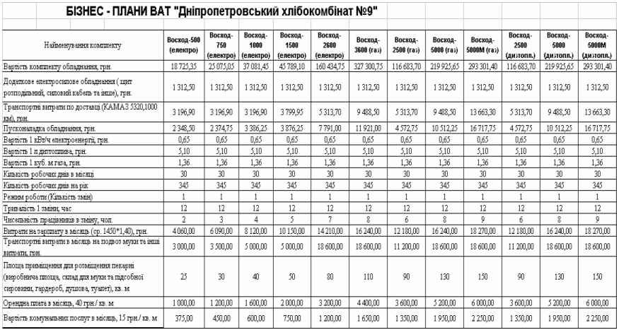 Рис. Ж.3. Перелік хлібопекарного обладнання ЗАТ НПП „Восход” ДОДАТОК К Таблиця К.1 Бізнес-плани розрахунків ВАТ „Дніпропетровський хлібзавод № 9”