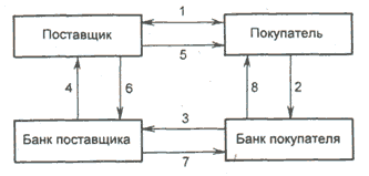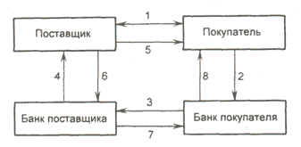 Рис. 6.4. Аккредитивная форма расчетов с использованием банковской гарантии: 1 - заключение договора о расчетах с использованием аккредитивной формы расчетов с предоставлением банком покупателя гарантии платежа; 2 - передача в банк заявления на открытие аккредитива под гарантию банка и отражение открытия аккредитива по внебалансовому счету «Гарантии и поручительства банка»; 3 - сообщение об открытии аккредитива и отражение открытия аккредитива по внебалансовому счету; 4 - сообщение поставщику об открытии аккредитива; 5 - поставка товара (оказание услуг); 6 - расчетные документы, подтверждающие отгрузку товара (оказание услуг), в соответствии с условиями договора направляются в банк поставщика и осуществляется зачисление средств на счет поставщика; 7 - дебетовое авизо направляется в банк покупателя, где производится списание средств со счета покупателя, при отсутствии средств на счете покупателя банк предоставляет плательщику кредит; 8 - сообщение покупателю о списании средств с его счета Безотзывный аккредитив не может быть изменен или аннулирован без согласия поставщика, в пользу которого он был открыт. Поставщик может досрочно отказаться от использования аккредитива, если это предусмотрено условиями аккредитива. 8 России аккредитив может быть предназначен для расчетов только с одним поставщиком и не может быть переадресован. Выплата с аккредитива наличными деньгами не допускается. Использование аккредитивов в международных расчетах регламентируется Унифицированными правилами и обычаями для документарных аккредитивов, утвержденных Международной торговой палатой в декабре 1993 г. Срок действия и порядок расчетов по аккредитиву устанавливается в договоре между плательщиком и поставщиком. Открытие банком-эмитентом гарантированных аккредитивов осуществляется по договоренности с покупателем и в соответствии с условиями корреспондентских отношений с другим банком. Выплаты по аккредитиву производятся в течение срока его действия, установленного в договоре сторон. При аккредитивной форме расчетов полностью соблюдаются все основные правила осуществления расчетов: продукция оплачивается после ее отгрузки; оплата производится с согласия плательщика, выраженного в данном случае самим фактом открытия аккредитива; плательщику предоставляется право отказаться от оплаты, если обнаружены нарушения условий договора; аккредитив открывается за счет средств покупателя или кредита банка, если покупатель имеет право на его получение. Положительной стороной аккредитивной формы расчетов является гарантия платежа. Вместе с тем этой форме расчетов присущ ряд существенных недостатков, которые и предопределили ограниченную сферу ее применения: средства покупателя в сумме аккредитива отвлекаются из его хозяйственного оборота на срок действия аккредитива; замедляется товарооборот, так как поставщик до извещения об открытии аккредитива не может отгрузить уже готовую продукцию и несет дополнительные затраты по ее хранению. Расчеты чеками. При расчетах чеками владелец счета (чекодатель) дает письменное распоряжение банку, выдавшему расчетные чеки, уплатить определенную сумму денег, указанную в чеке, получателю средств (чекодержателю). Чеки используются как физическими, так и юридическими лицами, выступают платежным ср
