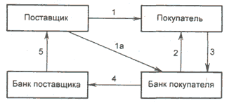 Рис. 6.6. Расчеты платежными требованиями-поручениями: 1 - поставка товара (оказание услуг); 1а - передача платежного требования-поручения в банк покупателя; 2 - расчетные документы передаются покупателю для акцепта; 3 - акцептованные расчетные документы возвращаются в банк, где производится списание средств со счета покупателя; 4 - перевод средств в банк поставщика и зачисление средств на счет поставщика; 5 - сообщение поставщику о зачислении средств на его банковский счет Зачет взаимных требований. В сложной системе хозяйственных связей существует возможность появления встречных потоков движения товарно-материальных ценностей и услуг. Эта ситуация служит основой применения такой специфической формы безналичных расчетов как зачет взаимных требований, т.е. перечисление со счета одной организации на счет контрагента только разницы (сальдо) встречных требований. Основное преимущество данной формы безналичных расчетов состоит в относительной простоте и экономичности. К зачету могут быть представлены различные расчетные документы: платежные требования-поручения, платежные поручения, расчетные чеки и др. При зачете взаимных требований происходит резкое сокращение движения средств. Они требуются только в сумме разницы, оставшейся после зачета. Зачеты взаимных требований бывают постоянно действующие и разовые. Постоянно действующие периодические расчеты по сальдо производятся обычно один раз в десять дней между двумя хозяйственными организациями на основе встречных, примерно равных поставок. Оба участника зачетов ведут у себя счета взаимных расчетов, на которых учитываются все суммы к платежам. Расчетные документы не сдаются в банк, а направляются сразу покупателю с отражением их суммы на счете взаимных требований. Периодически представители сторон выверяют счета взаимных расчетов, устанавливают, в чью пользу имеется сальдо, и на эту сумму выписывают либо платежное поручение, либо другой расчетный документ, который совершает традиционный документооборот. Разовые зачеты взаимных требований между двумя юридическими лицами осуществляются в том случае, если одна сторона при совершении платежа в пользу другой стороны имеет к ней встречные требования и претензии. Незачтенный остаток средств погашает сторона, которая должна была больше заплатить. Разовые групповые зачеты могут проводить банки на определенную дату (конец квартала, начало года) для устранения образовавшейся взаимной просроченной задолженности юридических лиц по расчетам друг с другом. Особенно широко зачет взаимных требований применялся в России в условиях командной системы экономики (1933-1987 гг.). Наибольшее распространение в те годы получили зачеты через отделы взаимных расчетов (ОВР) или бюро взаимных расчетов (БВР), создававшиеся в крупных организационных структурах, например, в министерствах для взаимозачета платежей предприятий одной отрасли или объединениях для зачета среди предприятий данного объединения, связанных единым производственным циклом. Такой подход позволял рационализировать платежный оборот. В настоящее время предприятия и организации, так же, как, впрочем, и банки, могут осуществлять взаимозачеты через клиринговые палаты (центры). Банки, их учреждения могут вводить расчеты путем зачета взаимных требований, организовывать с