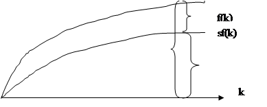 ![]() Рисунок 2 - График производственной функции в модели Р. Солоу График показывает, что капиталовооруженность k определяет размер выпуска продукции на одного работника: y = f (k). tga = MPK: если k увеличивается на одну единицу, то y возрастает на МРК единицу. По мере роста капиталовооруженности труда его производительность увеличивается, но с убывающей скоростью, т.к. МРК снижается. Совокупный спрос в модели Р. Солоу определяется инвестиционным и потребительским спросом. Уравнение выпуска продукции на одного работника имеет вид: g = с + i, (8) где с и i – потребление и инвестиции. Так как доход используется на потребление и накопление, то c = (1 – s) ·y , (9) где s – норма сбережений. Тогда y = c + i = (1 – s) · y + i, (10) откуда i = s·y. (11) То есть в условиях равновесия инвестиции равны сбережениям и пропорциональны доходу. В результате условие равенства спроса и предложения может быть представлено как: f (k) = c + i или f (k) = i/ s, (12) Производственная функция определяет предложение на рынке товаров, а накопление капитала – спрос на производственную продукцию. Объем же капитала меняется под воздействием инвестиции выбытия. Инвестиции в расчете на одного работника являются частью дохода, приходящегося на одного работника ( i = sy) или i = s • f(k), (13) Из этого следует, что, чем выше уровень капиталовооруженности k, тем выше уровень производства f(k) и больше инвестиции i (рис. 3). В модели Р.Солоу норма сбережений – ключевой фактор, определяющий уровень устойчивости капиталовооруженности. Более высокая норма сбережений обеспечивает больший запас капитала и более высокий уровень производства [4].