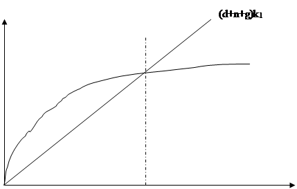Рисунок 4 – Рост населения Включение в модель технического прогресса изменит исходную производственную функцию g = f(K, L, e), (14) где e - эффективность труда одного работника (зависит от здоровья, образования, квалификации), Le – численность эффективных единиц рабочей силы. Технический прогресс вызывает прирост эффективности e с постоянным темпом g. Если g = 2%, то отдача от каждой единицы труда увеличиться на 2 % в год, а это равносильно тому, что объем производства возрастает так, как если бы рабочая сила за год выросла на 2 %. Это трудосберегающая форма технического прогресса. Если же численность занятых L растет с темпом n, а эффективность e растет с темпом g, то Le будет увеличиваться с темпом n + g. Капитал на единицу труда с постоянной эффективностью составит k1 + [K /(Le )], а объем производства на единицу труда с постоянной эффективностью y1 = g / (Le ). Состояние устойчивого равновесия достигается при условии: s • f(k1 ) = (d + n + g) • k1 , (15) где в – норма амортизации. Из равенства следует, что существует лишь один уровень капиталовооруженности k1 , при которой капитал и выпуск продукции, приходящиеся на единицу труда с неизменной эффективностью, постоянны (рис.5)