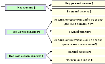 Рис. 1.1 - Классификация финансового анализа по основным видам Внутренний анализ проводится финансовыми службами предприятия, его результаты используются для планирования, контроля и прогнозирования финансового состояния предприятия. Цель данного вида анализа - обеспечить планомерное поступление денежных средств и разместить собственные и заемные средства таким образом, чтобы получить максимальную прибыль и исключить банкротство. Внешний анализ осуществляется кредитными и финансовыми учреждениями, инвесторами, поставщиками материальных и финансовых ресурсов, контролирующими органами на основе отчетности предприятия. Его целью является изучение платежеспособности предприятия, оценка его эффективной деятельности и возможности выполнения в установленные сроки своих финансовых обязательств.