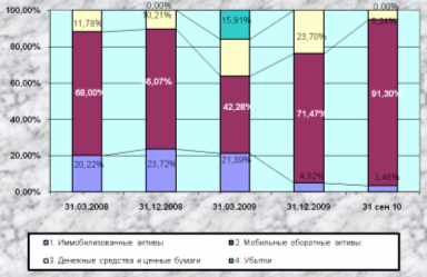 Как видно из таблицы 2.1, на последнюю отчетную дату, иммобилизованные (внеоборотные) активы составляют 3,46% от всех активов или 49 221 тыс. руб. На начало исследуемого периода они составляли 2 471 тыс. руб. В период с 31.03.08 по 31.12.09 г. наблюдается незначительное их колебание, однако по состоянию на 31.09.2010 произошел резкий подъем как в процентном (1849,35%), так и в денежном выражении (49 221 тыс. руб.). Данный рост величины иммобилизованных (внеоборотных) активов в конце исследуемого периода объясняется покупкой объекта незавершенного строительств, что указывает на стабильное финансовое состояние предприятия. Однако, следует учитывать, что приобретение произошло за счет заемных средств. Этот показатель не является фактором риска, приводящего к недостатку финансирования внеоборотных активов. Кроме того, в конце отчетного периода предприятие увеличило стоимость основных средств. Мобильные оборотные активы к концу исследуемого периода составляют 91,3 % всех активов, или 1 298 963 тыс. руб. Их рост сначала исследуемого периода составил 1 290 654 тыс. руб. Основу мобилизованных активов составляют: - дебиторская задолженность – 1 298 963 тыс. руб (91,30%); - запасы и затраты – 4 441 тыс. руб (0, 31%); - прочие оборотные активы составили 0% активов предприятия. Дебиторская задолженность предприятия значительно возросла в последний исследуемый период, и составляет 90,99% от суммы всех оборотных активов предприятия, что может явиться следствием ухудшения финансово-хозяйственной деятельности предприятия. Необходимо обратить на это внимание, и уменьшить риск её не возврата. Денежные средства и ценные бумаги на конец исследуемого периода составляют 74 506 тыс. руб, что составляет 5,24% от общей суммы активов. Более наглядно состав и динамику активов показывает График 1.1.