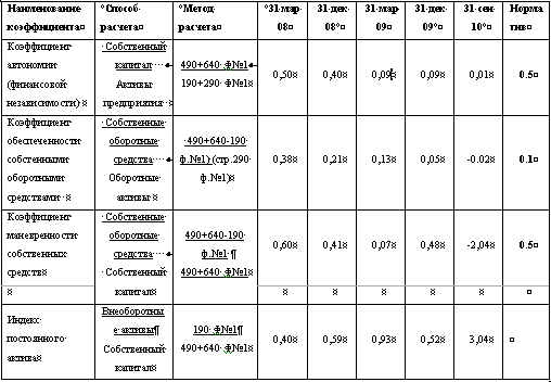 График 2.3 – Динамика коэффициентов ликвидности Как видно из графика коэффициентов ликвидности, в деятельности предприятия не наблюдается достаточная стабильность, которая позволяет сделать вывод о рациональности использования денежных средств и отсутствии риска утраты платежеспособности. Для выявления реальной возможности у предприятия утратить платежеспособность необходимо проверить равенство коэффициентов. Структура баланса предприятия признается удовлетворительной при условии, что коэффициент текущей ликвидности будет больше или равен 2, а коэффициент обеспеченности оборотных активов собственными оборотными средствами больше либо равно 0,1. В нашем случае структура баланса признается неудовлетворительной, (расчет коэффициента обеспеченности оборотных активов собственными оборотными средствами приведен ниже) и само предприятие неплатежеспособным, поэтому необходимо рассчитать коэффициент восстановления платежеспособности, который определяется как отношение расчетного значения коэффициента текущей ликвидности к его нормативному значению. Расчетное значение коэффициента текущей ликвидности определяется как сумма фактического значения данного коэффициента на конец отчетного периода и изменения значения этого коэффициента в пересчете на период восстановления платежеспособности.