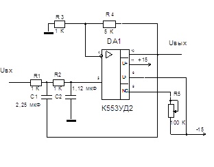 Рис. 3. Схема активного ФНЧ. В данном случае использована схема ФНЧ второго порядка Салена-Ки [3]. В этой схеме можно получить коэффициент усиления по напряжению больше 1. Этот коэффициент можно рассчитать по формуле Кu=1+R4/R3 (1) Если от фильтра требуется равномерность частотной характеристики в полосе частот от 0 до ώ0, то для расчета используются формулы: C1=(R1+R2)/(√2*R1*R2* ώ0) (2) C2=√2/((R1+R2)* ώ0) (3) В схеме используется два RC звена, поэтому скорость спада частотной характеристики составляет – 40 дБ/дек. Для увеличения скорости спада АЧХ можно включать такие фильтры последовательно, что увеличивает порядок фильтра и скорость спада АЧХ соответственно. Диапазон входного однополярного напряжения микросхемы АЦП 0,5...+10,5 В, а максимальная амплитуда входного сигнала (по заданию) 3 В, поэтому требуется коэффициент усиления по напряжению Кu=3, при этом опорное напряжение для микросхемы АЦП требуется 9 В. По формуле (1) находим значения R3, R4: R4/R3 = Кu-1 R4/R3=2, поэтому выбираем R3= 1 КОм, R4= 2 Ком R3 - тип С2-23, R4 – тип С1-4. Для нахожденияС1, С2: ώ0=Fc*2π=200*6.28=1256 выбираем R1=R2= 1 КОм, тогда по формулам (2), (3): С1=(2000)/(1,41*1000000*1256)=1,129 мкФ С2=1,41/(2000*1256)=0,561 мкФ Выбираем: С1 - тип К10-17Б H90 ( 1 мкФ), С2 - тип К10-17А H90 ( 0,47 мкФ) В качестве операционного усилителя будем использовать К553УД2. Принципиальная схема активного ФНЧ представлена на рисунке 4. резистор R5 служит для установки 0.